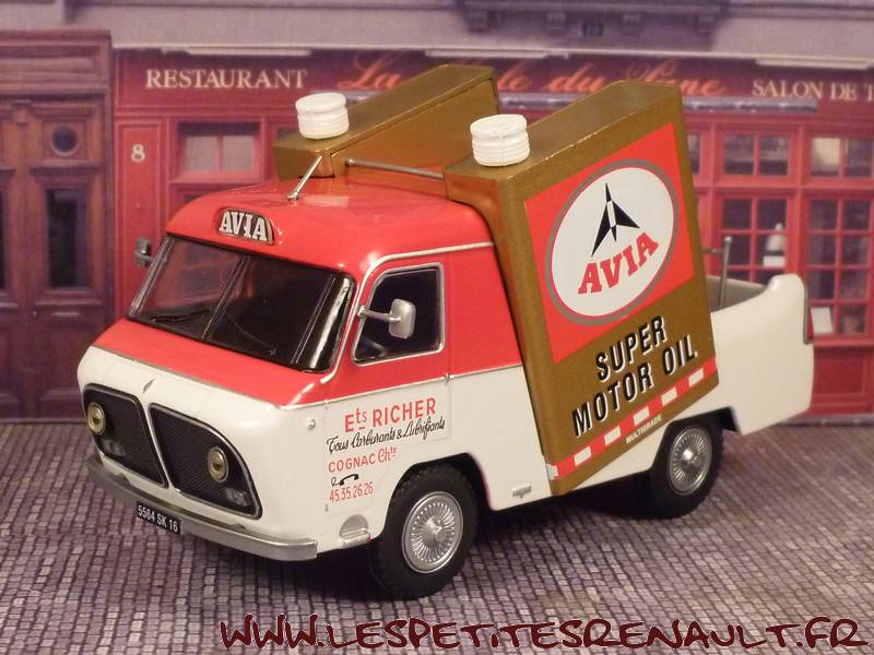 Modèle : 1400 Kg pick up Type : R 2086 Année : 1957 Couleur : Rouge et blanc Echelle : 1/43 Fabricant : Ixo Référence 11 Collection : Véhicules publicitaires (Auto Plus) Matière : Zamak et plastique Série limité : Non Boitage : Socle + Blister Commentaires : Modèle unique aux couleurs d'Avia réalisé en 1957 par Le Bastard à Rouen et utilisé par les établissements Richer, un distributeur Avia de Cognac en Charente. |
