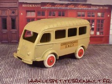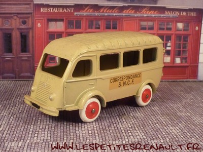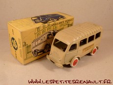 Modèle : Renault 1000kg autobus Année : 1954 Couleur : Beige Echelle : 1/45 Fabricant : CIJ Référence : 3/62 Collection : -- Matière : Zamak, châssis tôle Série limité : Non Boitage : Boite carton Commentaires : Version transport SNCF. Modèle sans plaque d'immatriculation à l'arrière sur le toit. |