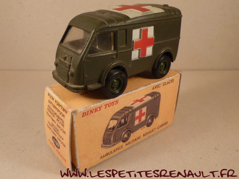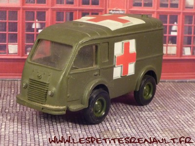 Modèle : Renault 1000 kg tôlé Année : 1956 Couleur : Kaki Echelle : 1/55 Fabricant : Dinky Toys Référence : 80F Collection : -- Matière : Zamak, châssis tôle Série limité : Non Boitage : Boite carton Commentaires : Type R2065. Version ambulance militaire. Modèle fin de production avec châssis et jantes plastique de nombreux détails supplémentaires sur le moule de la caisse (prise d'air, ...) |