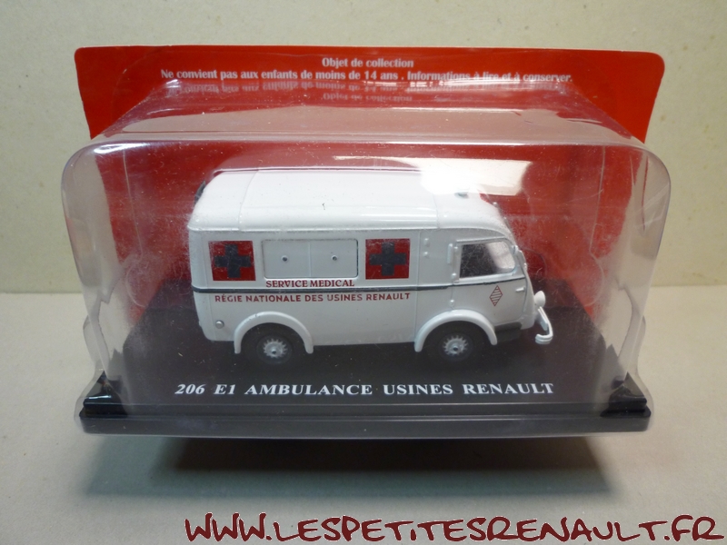 Modèle : 206 E1 Année : 1945 Couleur : Blanc Echelle : 1/43 Fabricant : Ixo Référence : 35 Collection :Utilitaires Renault (Hachette) Matière : Zamak, châssis plastique Série limitée : Non Boitage : Socle + blister Commentaires : Version ambulance utilisée au sein des usines Renault |