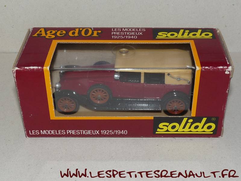 Modèle : 40 cv Berline Année : 1926 Couleur : Bordeaux Echelle : 1/43 Fabricant : Solido Référence N/A Collection : L'âge d'or Matière : Zamak Série limité : Non Boitage : Boite cristal, surboite Solido Commentaires : Type NM, version avec roues marrons, sans suspension, sans malle, capot ouvrant. Attention, il semble que cette version n'ait jamais été produite par Solido (version capotée avec roues marron). Il s'agit certainement d'une Laundelet (rèf 4143) pour laquelle une capote fermée remplace celle ouverte |