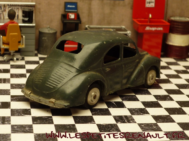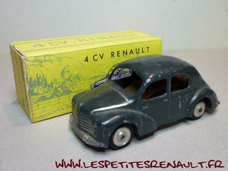 Modèle : 4 cv berline Année : 1949 Couleur : Gris foncé Echelle : 1/45 Fabricant : CIJ Référence : 3/48 Collection : -- Matière : Zamak, châssis tôle Série limitée : Non Boitage : Boite carton Commentaires : Version 6 moustaches, jantes en alu, châssis clipsé par des agrafes et moteur à clé |