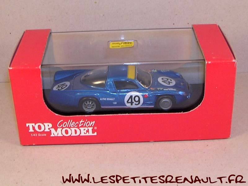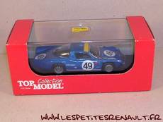 Modèle : Alpine A 210 1.3L Année : 1967 Course : Le Mans Equipage : #49 - De Cortanze/Le Guellec Couleur : Bleue métallisé Echelle : 1/43 Fabricant : Top Model Référence : TMC218 Collection : Non Matière : Résine, châssis plastique Série limité : Non Boitage : Boite cristal 8x15, surboite carton TMC Commentaires : Alpine A 210 1,3L #49 de l'écurie Savin Calberson pilotée par André De Cortanze et Alain Le Guellec. Elle sera classée 10ème avec 318 tours couverts et 2ème de sa catégorie. Voiture avec bandeau de toit blanc |