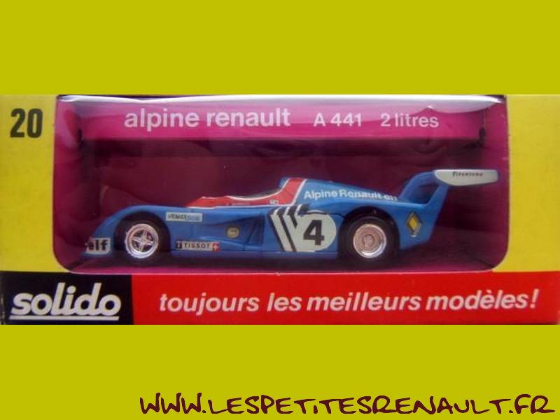 Modèle : Alpine A 441 Année : 1974 Course : Championnat d'Europe Equipage : #4 Alain Serpaggi Couleur : Bleue Echelle : 1/43 Fabricant : Solido Référence : 20 Collection : Gam2 Matière : Zamak Série limité : Non Boitage : Boite carton + plastique Commentaires : Moteur V6 2L de 285ch au lieu de 270ch pour l'A 440. 3 exemplaires de l'A441 ont été construits |