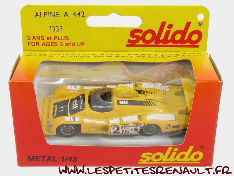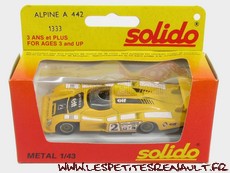 Modèle : Alpine A 442 B Année : 1978 Course : 24 heures du Mans Equipage : #2 - Pironi/Jaussaud Couleur : Jaune et noire Echelle : 1/43 Fabricant : Solido Référence : 1333 Collection : Non Matière : Zamak, châssis plastique Série limité : Non Boitage : Boite carton + plastique Commentaires : Version 2L V6 turbo qui a remporté les 24h du Mans en 1978 |