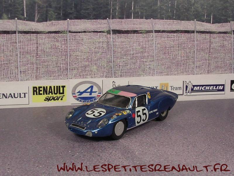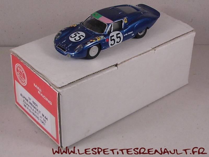 Modèle : Alpine M64 Année : 1967 Course : 24 heures du Mans Equipage : #55 - Therier/Chevallier Couleur : Bleu métallisé Echelle : 1/43 Fabricant : Mini Racing Référence : 0231 Collection : Non Matière : Résine, châssis zamak Série limité : Non Boitage : Boite carton Commentaires : Kit monté. Abandon à la 18ème heure sur problème moteur |