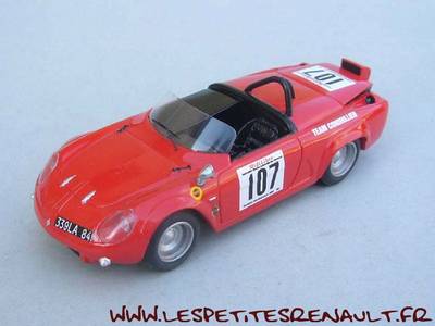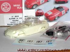 Modèle : Alpine A 110 spider Année : 1968 Course : Ronde Cévenole Equipage : #107 - JP Albisson Couleur : Rouge Echelle : 1/43 Fabricant : Mini Racing Référence : 0610 Collection : Non Matière : Résine Série limité : Non Boitage : Boite carton Commentaires : Kit non monté. Spider construit à partir d'une caisse de A110 accidentée et équipé d'un moteur R10 1600 cm3 de 145ch préparé par Condrillier. Le poids de la voiture était de 450kg |
