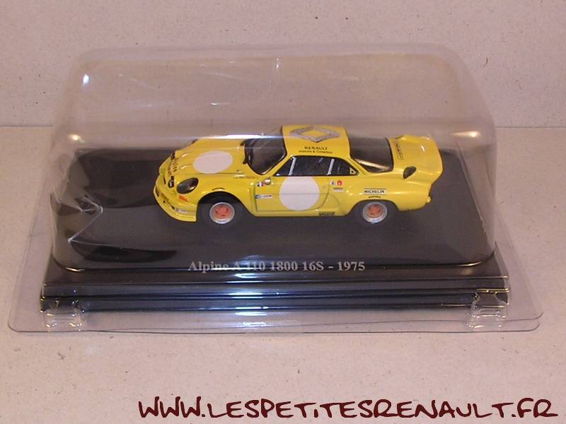 Modèle : Alpine A 110 1800 16S Gr4 Année : 1975 Course : Tour de France Couleur : Serpaggi/Prevost Couleur : Jaune Echelle : 1/43 Fabricant : Eligor Référence : 32 Collection : Alpines et Renault sportives (Hachette) Matière : Zamak, châssis plastique Série limité : Non Boitage : Socle + blister Commentaires : Exemplaire restauré par Renault "Histoire et Collection". A aussi participé au Tour Auto de 2006 avec le numéro 204 et à son bord le même équipage qu'en 1975. |