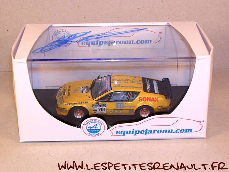 Modèle : Alpine A 310 V6 Année : 2007 Course : Saison YTCC (NL) Equipage : #201 - Randall Lawson Couleur : Jaune Echelle : 1/43 Fabricant : Eligor Référence : E-EAJ 002 Collection : Non Matière : Zamak, châssis plastique Série limité : 250 ex. Boitage : Boite cristal 7x15 + surboite Jaaron Commentaires : Fabrication spéciale réalisée pour l'équipe Jaronn. Boite dédicacée |