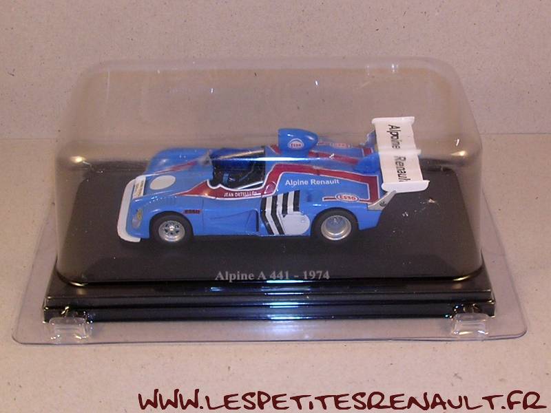 Modèle : Alpine A 441 Année : 1974 Course : Championnat d'Europe Equipage : Jean Ortelli Couleur : Bleue Echelle : 1/43 Fabricant : Eligor Référence : 38 Collection : Alpine et Renault sportives (Hachette) Matière : Zamak, châssis plastique Série limité : Non Boitage : Socle + Blister Commentaires : Version de présentation. Moteur V6 2L de 285ch au lieu de 270ch pour l'A 440. 3 exemplaires e l''A441 ont été construits |