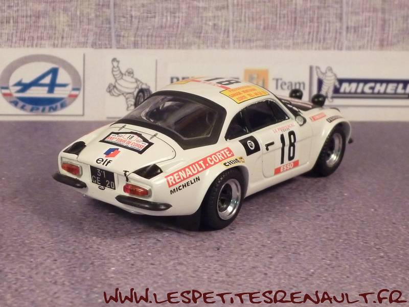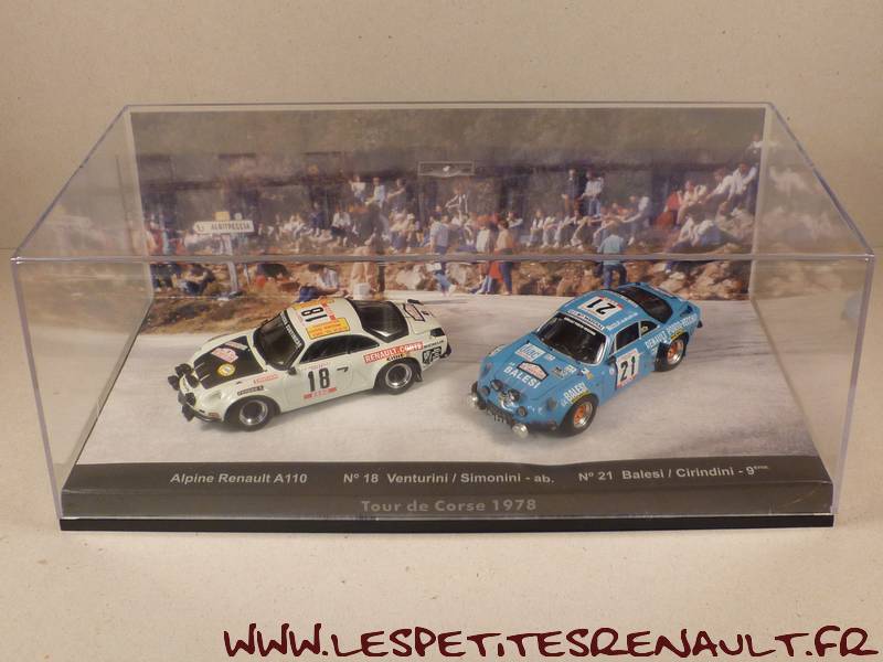 Modèle : Alpine A 110 Année : 1978 Course : Tour de Corse Equipage : #18 - Venturini/Simonini Couleur : Blanche Echelle : 1/43 Fabricant : Trofeu Référence : MINITDC07 Collection : Non Matière : Zamak, châssis plastique Série limité : 250 exemplaires Boitage : Boite cristal 22x11 Commentaires : 2 alpines livrées dans le même coffret. Réalisation spéciale pour www.minitdc.com |