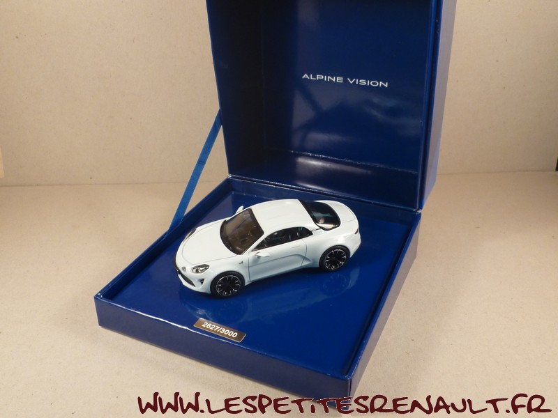 Modèle : Alpine Vision Année : 2016 Couleur : Blanche Echelle : 1/43 Fabricant : Norev Référence : 7711780355 Collection : Non Matière : Zamak, châssis plastique Série limité : 2627/3000 Boitage : Coffret carton Alpine Commentaires : Le concept Alpine Vision a été présenté à Monaco, le 16 février 2016. Showcar très proche du futur modèle de série Alpine A110 qui sera commercialisé en 2017. |