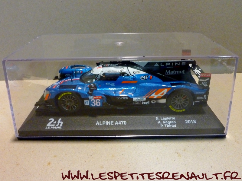 Modèle : Alpine A 470 Année : 2018 Course : 24h du Mans Equipage : #36 Lapierre-Negrao-Thiriet Couleur : Bleu métallisé Echelle : 1/43 Fabricant : Ixo Référence : 4 Collection : 24h Le Mans (Ixo Collections) Matière : Zamak, châssis plastique Série limitée : Non Boitage : Boite cristal + blister Commentaires : Vainqueur en catégorie LMP2 |