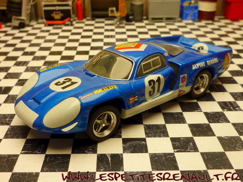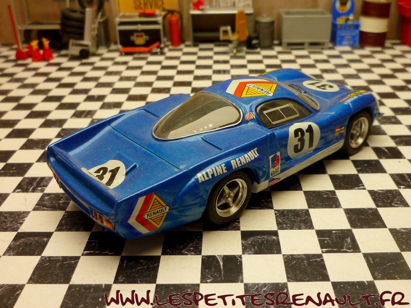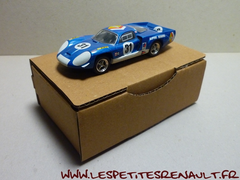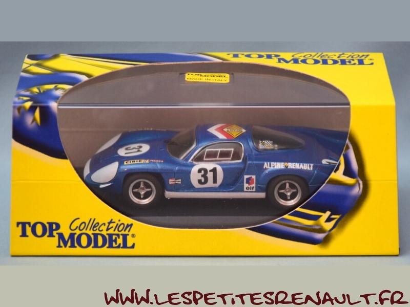 Modèle : Alpine A 220 Année : 1969 Course : 24 heures du Mans Equipage : JL Thérier - JP Nicolas Couleur : Bleu métallisé Echelle : 1/43 Fabricant : Top Model Référence : TMC 275 Collection : Non Matière : Résine Série limitée : Non Boitage : Boite cristal + surboite Top Model Commentaires : Alpine A 220/68, Moteur V8 2996cc Engagée par la Société des automobiles Alpine 20ème aux essais (215.504 Km/h) Abandon en course après 1h30, joint de culasse |