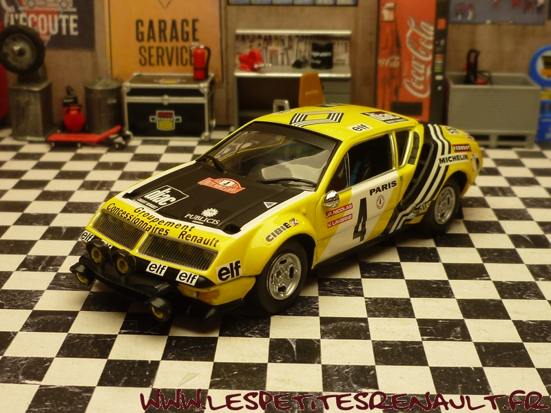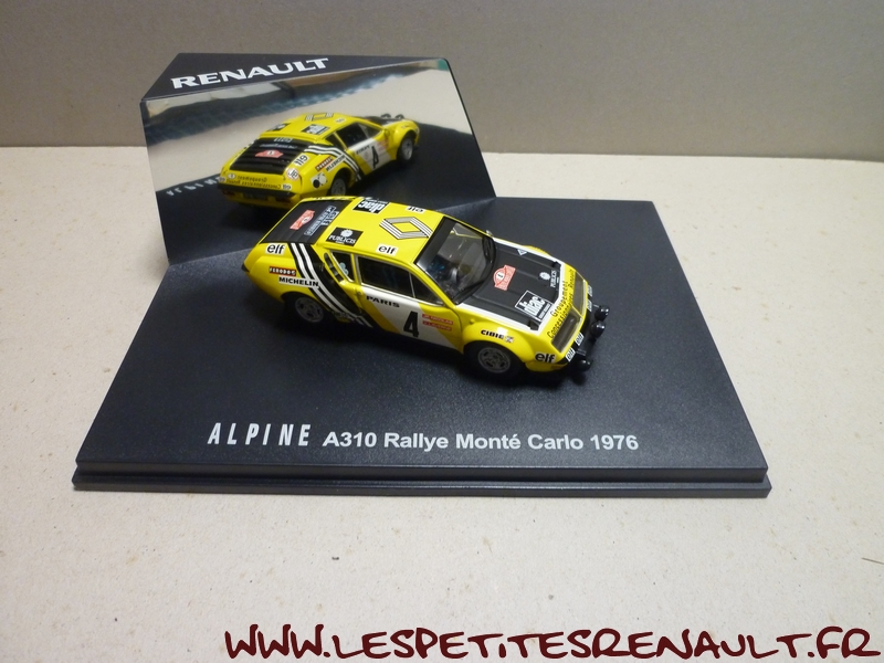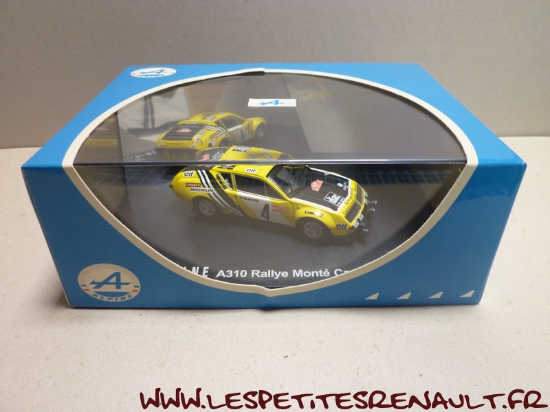 Modèle : Alpine A 310 Année : 1976 Course : Rallye de Monte Carlo Equipage : #4 Nicolas / Laverne Couleur : Jaune et noire Echelle : 1/43 Fabricant : Ixo Référence : 7711421922 Collection : Non Matière : Zamak, châssis plastique Série limitée : Non Boitage : Boite cristal + surboite Alpine Commentaires : Abandon après la 18ème spéciale sur problème de différentiel |