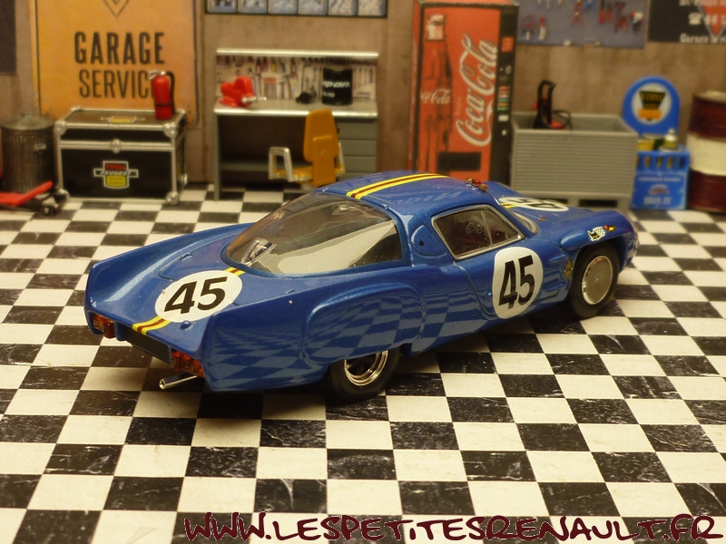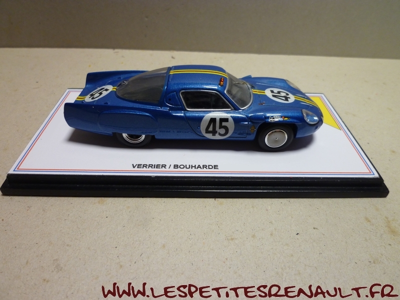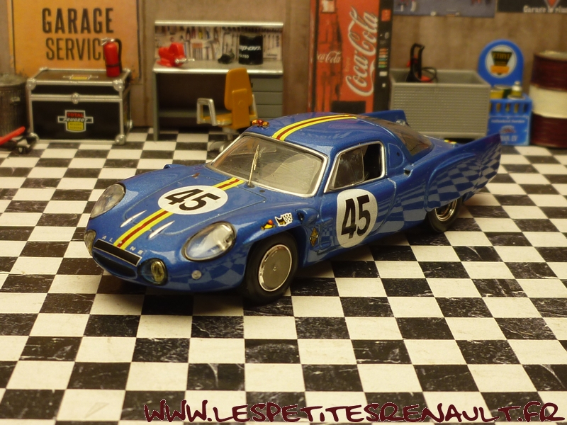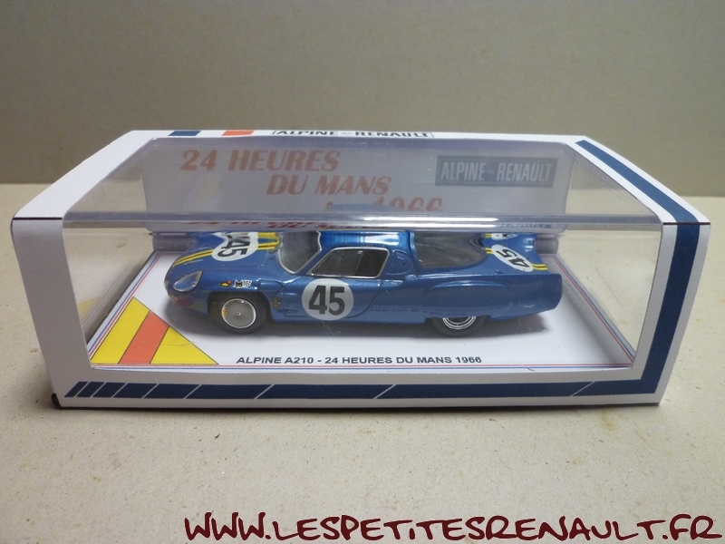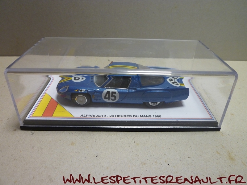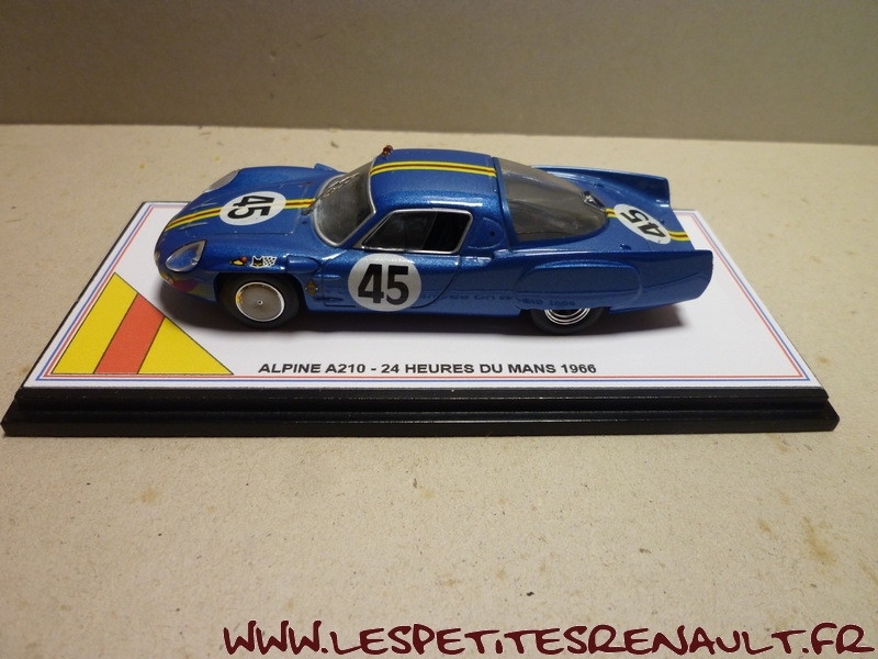 Modèle : Alpine A 210 1300 Année : 1966 Course : 24 heures du Mans Equipage : #45 Verrier / Bouharde Couleur : Bleu métallisé Echelle : 1/43 Fabricant : Base Ixo Référence : Inconnue Collection : Non Matière : Zamak, châssis plastique Série limitée : Oui Boitage : Boite cristal + surboite Commentaires : 12ème avec 307 tour. Réalisation artisanale sur base Ixo |