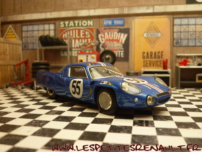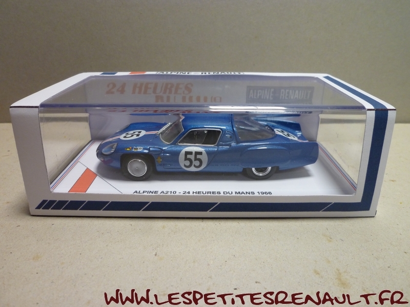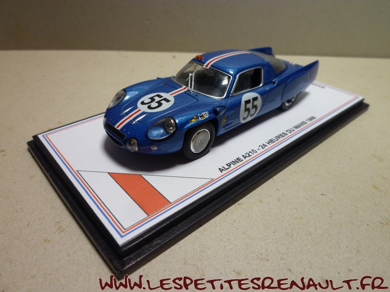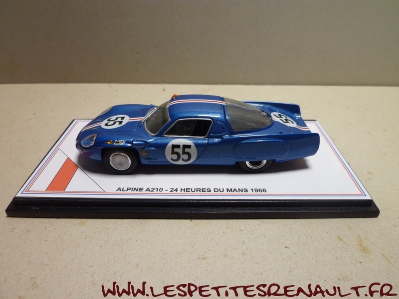 Modèle : Alpine A 210 1L Année : 1966 Course : 24 heures du Mans Equipage : #55 De Cortanze / Hanrioud Couleur : Bleu métallisé Echelle : 1/43 Fabricant : Base Ixo Référence : Inconnue Collection : Non Matière : Zamak, châssis plastique Série limitée : Oui Boitage : Boite cristal + surboite Commentaires : Abandon (pompe à eau) après 118 tours. Réalisation artisanale sur base Ixo |