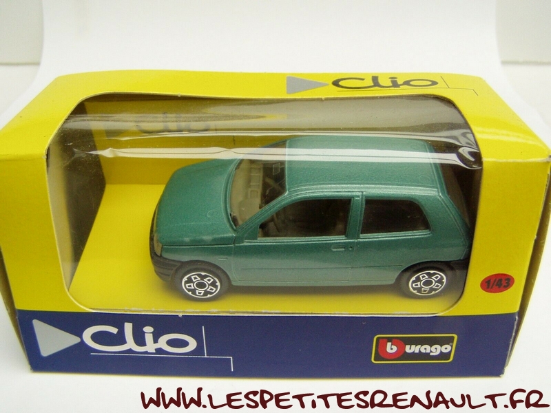Modèle : Clio I ph1 RT Année : 1990 Couleur : Vert métallisé Echelle : 1/43 Fabricant : Bburago Référence : 4130 Collection : Non Matière : Zamak, châssis plastique Série limitée : Non Boitage : Boite carton + plastique Commentaires : Version fantaisiste destinée aux enfants |