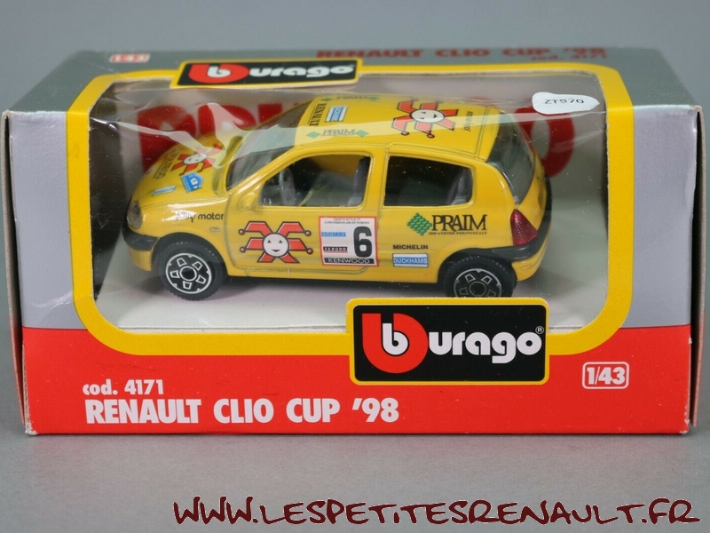 Modèle : Clio II ph1 Année : 1998 Course : Rallye San Martino Equipage : #6 - Couleur : Jaune Echelle : 1/43 Fabricant : Bburago Référence : 4171 Collection : Non Matière : Zamak, châssis plastique Série limitée : Non Boitage : Boite carton + plastique Commentaires : Version fantaisiste destinée aux enfants |