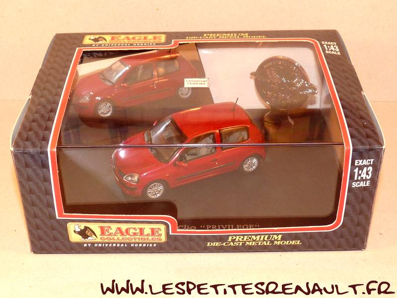 Modèle : Clio II phase 2 Année : 2002 Couleur : Rouge métallisé Echelle : 1/43 Fabricant : Universal Hobbies Référence : 7711218619 Collection : Non Matière : Zamak, châssis plastique Série limitée : Non Boitage : Boite cristal 12x17 - Surboite Eagles Commentaires : Version Privilège |