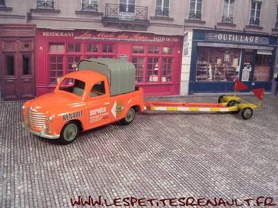 Modèle : Colorale Pick-Up Année : 1954 Couleur : Orange Echelle : 1/45 Fabricant : CIJ (Norev) Référence : 3/65/01 Collection : Non Matière : Zamak, châssis tôle Série limité : Non Boitage : Boite carton Commentaires : Décoration Renault Services. Ré-édition par Norev |