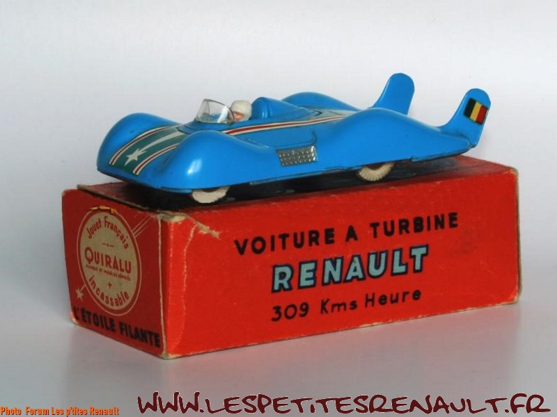 Modèle : Etoile Filante Année : 1956 Couleur : Bleue Echelle : 1/43 Fabricant : Quiralu Référence : 16 Collection : Non Matière : Zamak, châssis tôle Série limitée : Non Boitage : Boite carton Commentaires : Véhicule propulsé par une turbine à gaz Turbomeca de 270 chevaux qui établiera un record de vitesse terrestre de 308,85 km/h, le 5 septembre 1956 sur la piste de Bonneville aux Etats-Unis |