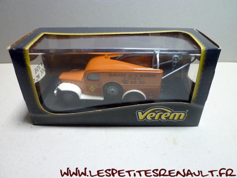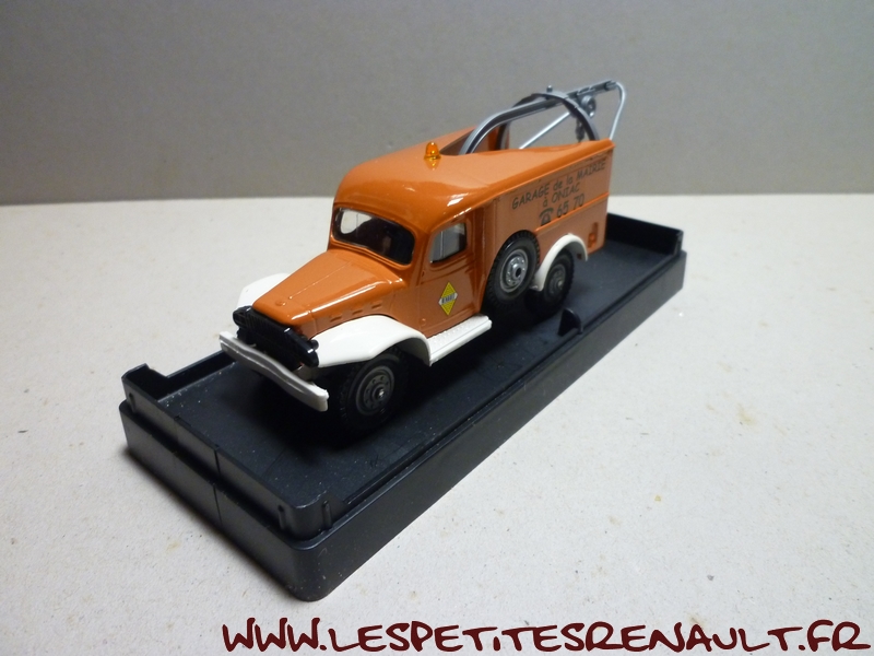 Modèle : Dodge WC 56 Année : 1940 Couleur : Orange et blanc Echelle : 1/50 Fabricant : Verem Référence : V298 Collection : Non Matière : Zamak et plastique Série limitée : Non Boitage : Boite cristal + surboite Commentaires : Annoncé comme WC56, mais peu probable car le WC56 était un véhicule châssis court de commandement. Véhicule utilisé comme dépanneuse dans les années 1970 |