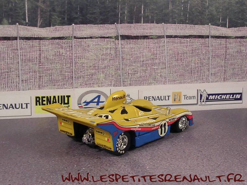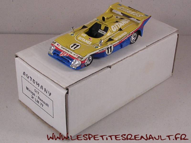 Modèle : Mirage Renault M8 Année : 1977 Course : Le Mans Equipage : #11 - Posey/Leclerc Couleur : Jaune et bleue Echelle : 1/43 Fabricant : Automany Référence : 517 Collection : Non Matière : Résine, châssis zamak Série limitée : Non Boitage : Boite carton Commentaires : Transkit sur base Verem. Décoration inversée. Abandon 5ème heure |