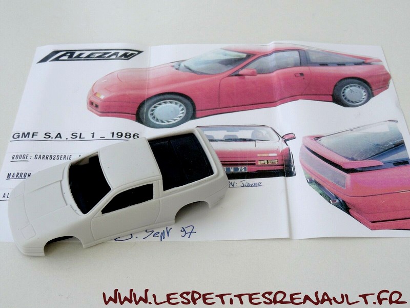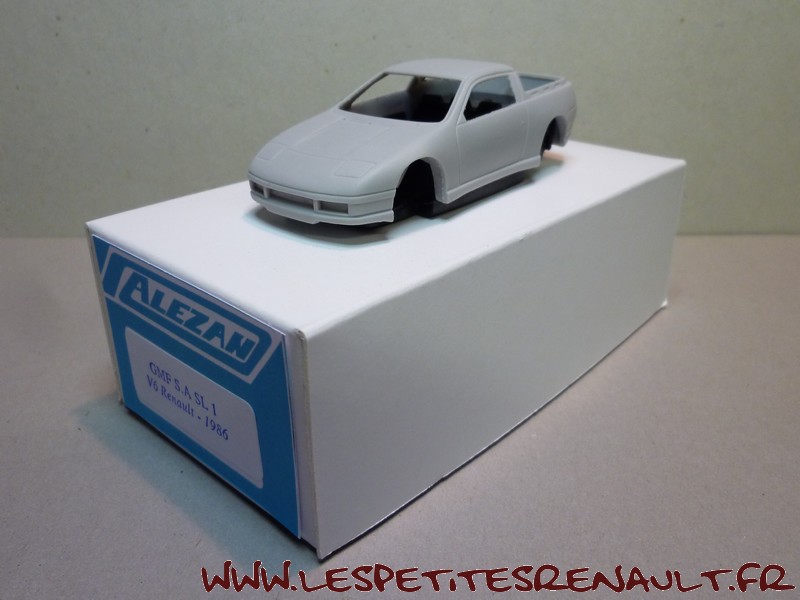 Modèle : GMF SA SL1 V6 Renault Année : 1986 Couleur : Kit non peint Echelle : 1/43 Fabricant : Alezan Référence : 210 Collection : Non Matière : Résine Série limitée : Non Boitage : Boite carton Commentaires : Prototype exposé en 1986 au Mondial de Paris, et conçue par le département automobiles GMF ( Garage Mutualistes de France S.A.) basé à Torcy en Seine & Marne. L'auto était prévue avec un V6 PRV turbo de 2,5L, 200CV pour 250 km/h ! Prix 300.000 fr à l'époque |