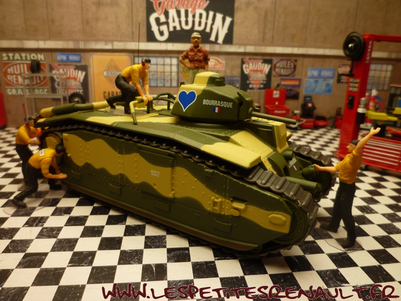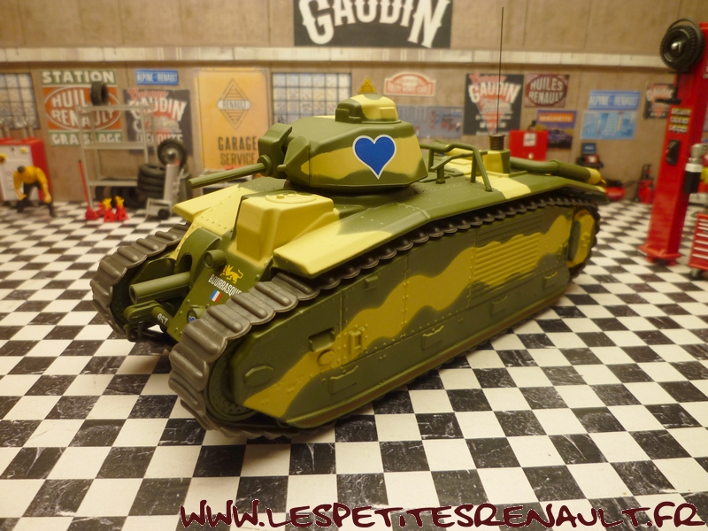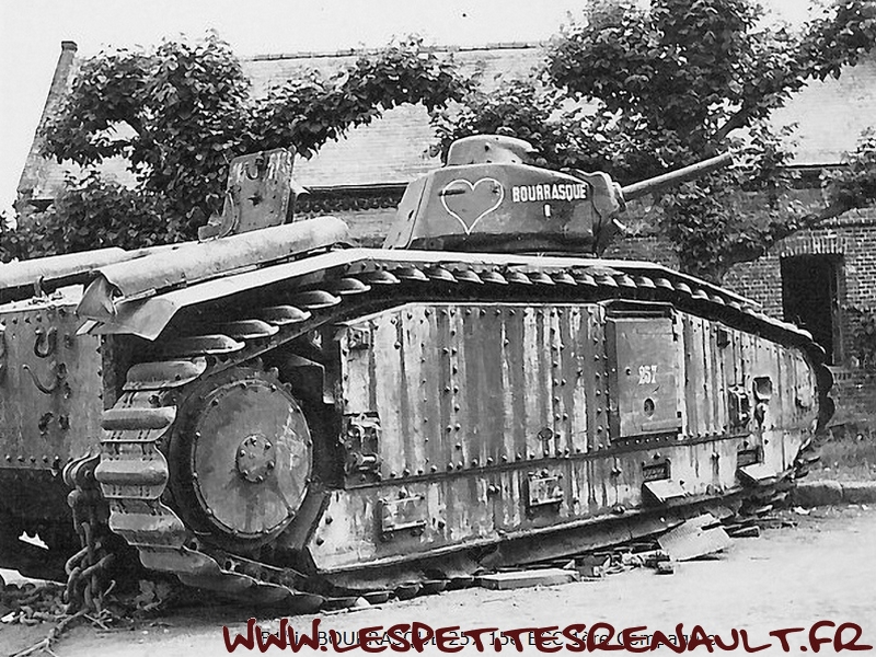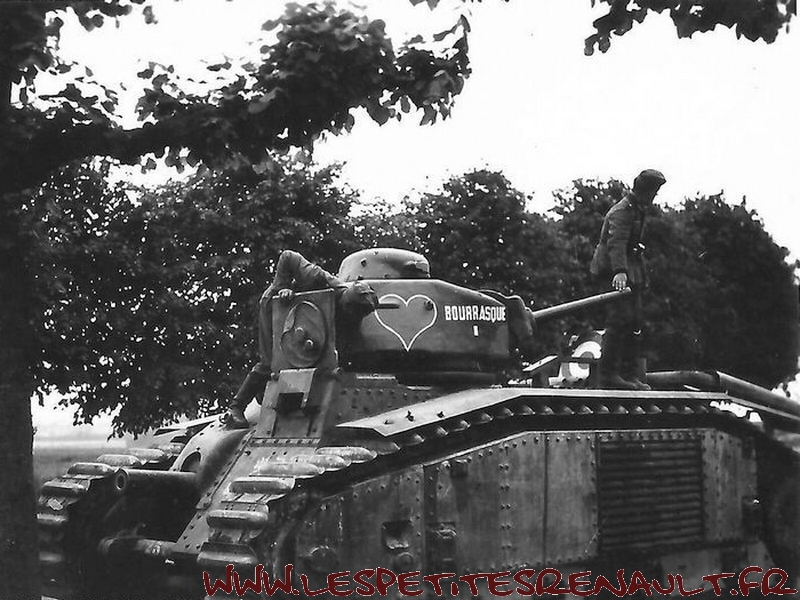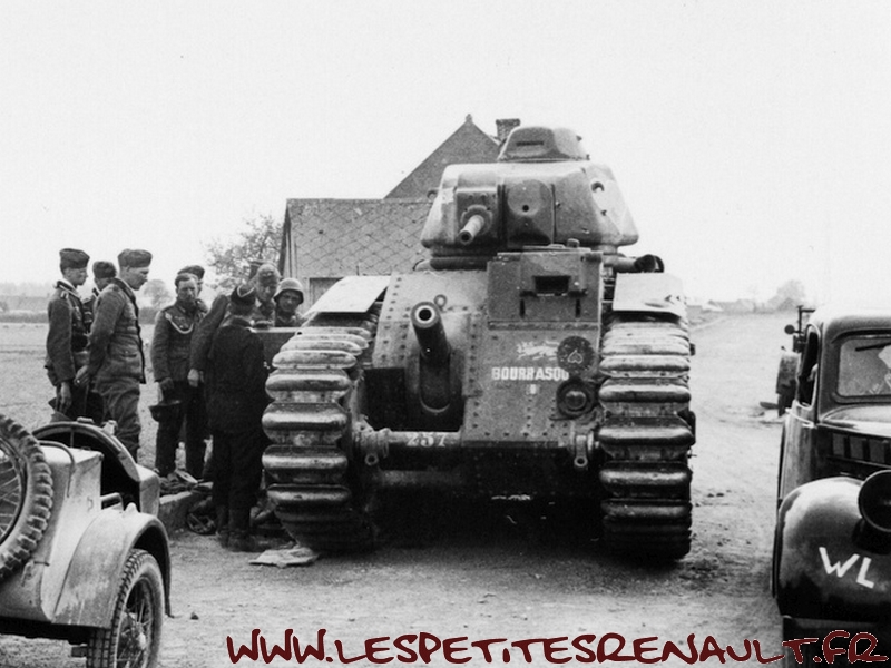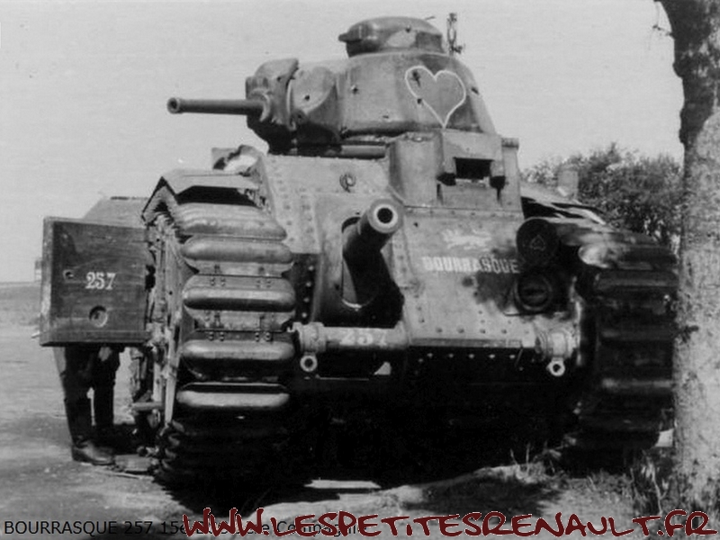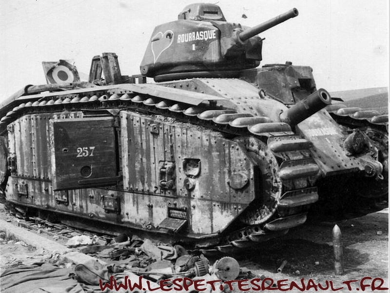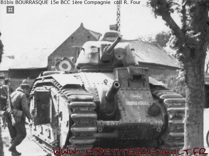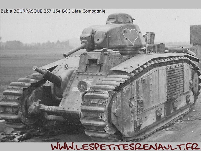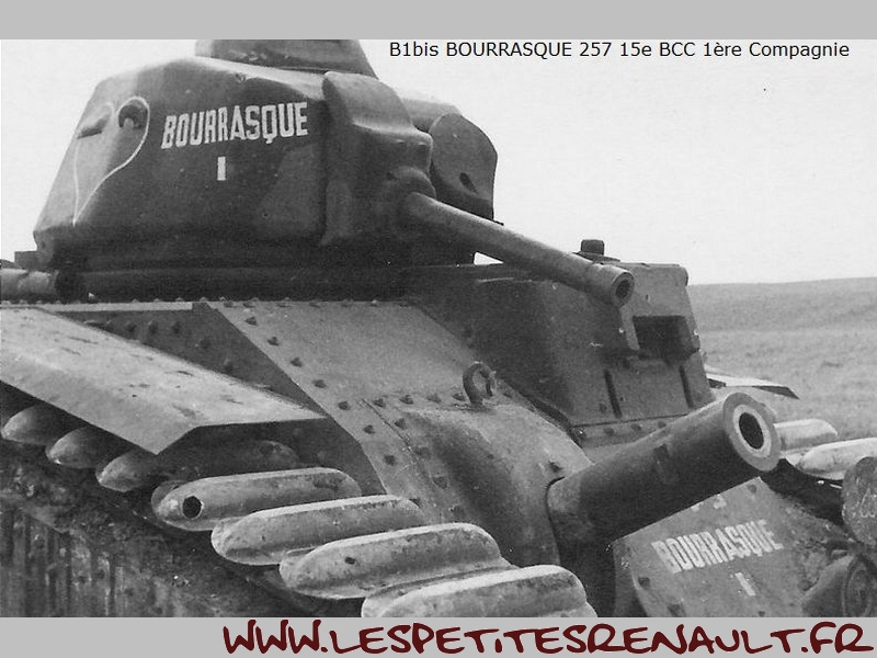 Char Renault B1bis La version initiale (qui donnera naissance au B1 Bis) était souvent appelée improprement Renault B1, mais Renault n'en était que le plus gros producteur. Le B1 fut développé et produit par un ensemble de sociétés, FAMH, FCM et AMX, travaillant ensembles, sous la direction technique de l'arsenal de Rueil. Livré au 508e RCC à Lunéville début 1939. Versé au 15e BCC 1ère compagnie en septembre 1939. 33 chars de combats 2e DCR Le 17 mai 1940 Au cours des engagements du 16 mai autour de Montcornet, plusieurs chars du 15e BCC sont endommagés ou en panne. Quatre chars avariés, le TEMPETE, Le MARTINIQUE, l'AQUITAINE, le TOULON se regroupent autour du BOURRASQUE en bon état. La nuit tombe, les réservoirs sont presque vides. Après concertation, deux engins sont sabordés : le MARTINIQUE et l'AQUITAINE. Le BOURRASQUE prend en remorque le TOULON et le TEMPETE. Au matin du 17 mai, vers 6 heures, les chars sont rejoints par un camion allemand rempli de fantassins. Un coup de 47 détruit le camion et les soldats allemands sont dispersés par les mitrailleuses des chars. Mais le BOURRASQUE est à court d'essence. Les équipages transvasent dans ses réservoirs le carburant restant des autres engins, puis le BOURRASQUE, dételé, part en direction du sud, vers Pargny, à la recherche d'un ravitaillement. Pargny passé sans encombre, le BOURRASQUE tombe sur la brigade de chars allemande Nedwig avançant vers l'Oise. Tout en roulant le long des colonnes du bataillon motocycliste n°1 en marche vers Mortiers, le char français tire, semant le désordre par les destructions qu'il provoque. Après Mortiers, le bataillon du Pz.Rgt.1 réagit, attaque au canon le BOURRASQUE qui finit par tomber en panne d'essence, piqué de coups de 37mm et de quelques coups de 75mm. A 11h15, toutes munitions épuisées, l'équipage se rend et est extrait un à un du char par les allemands. Equipage : Chef de char : Lieutenant Sauret Pilote : Sergent Seguin Aide-pilote : Caporal Gentner blessé Radio : Chasseur Mogrédien En plus de son équipage, le char transportait le lieutenant Vaucheret, les sergents Seguin et Courberand Dimensions Longueur : 6.37 m Largeur : 2.50 m Hauteur : 2.79 m avec tourelle, 1.80 sans tourelle Poids : 29 tonnes à vide Empattement : 5.23 m Blindage : 60 mm maximum Performances Moteur : 300ch Renault, appareil de direction Naeder Rapport poids/puissance : 9.3 ch/tonne Vitesse maximum sur route : 25 km/h Vitesse maximum en terrain varié : 21 Km/h ( moyennement accidenté), 15 km/h ( terrain accidenté) Consommation moyenne sur route : 220 litres/100 km Franchissement à bords francs : 2.75 m Pente maximum : 40°5, soit 90% Rayon d'action : 180 Km Stabilité transversale : 35° Equipage 1 chef de char : service des armes de tourelle et de la mitrailleuse fixe 1 pilote spécialiste : conduite et pointage du canon de 75, éventuellement tir 1 aide-pilote : chargeur, tir du canon de 75 et aide dépanneur 1 radiotélégraphiste Armement 1 canon de 75 mm 1 mitrailleuse fixe Châtellerault modèle 1931 1 canon de 47mm 1 mitrailleuse sous tourelle Munitions 74 obus de 75 dont 7 de rupture et 6 amorcés 50 obus de 47 dont 20 explosifs 5100 cartouches de mitrailleuses Près de 403 chars B1bis ont été construits avant la guerre et seulement 366 ont été livrés à l'armée. Coûteux, difficile à construire et à manoeuvrer - seuls les militaires d'active étaient habilités à le piloter. Il était très populaire parmis les responsables militaires et politiques de l'époque. Source texte et photos : chars-francais.net |