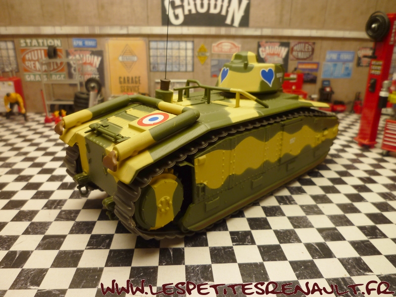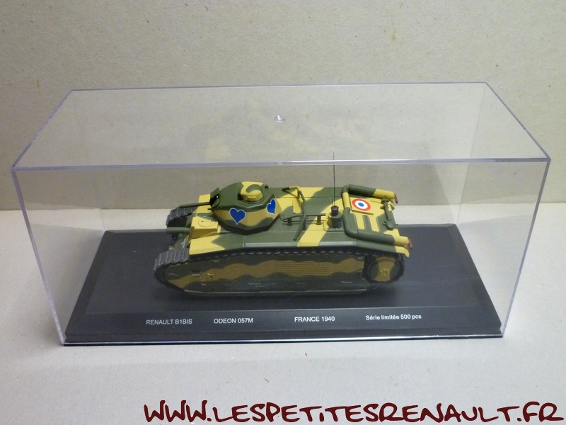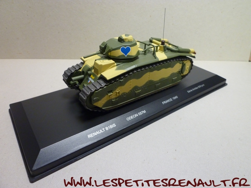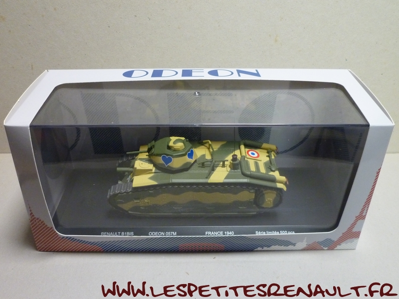 Modèle : Char B1 Bis Année : 1940 Couleur : Kaki et beige Echelle : 1/43 Fabricant : Odéon Référence : ODEON57M Collection : Non Matière : Zamak et plastique Série limitée : 500 ex. Boitage : Boite cristal + surboite Odéon Commentaires : Exemplaire identifié "Bourrasque" dans sa version utilisée autour de Montcornet en mai 1940. |