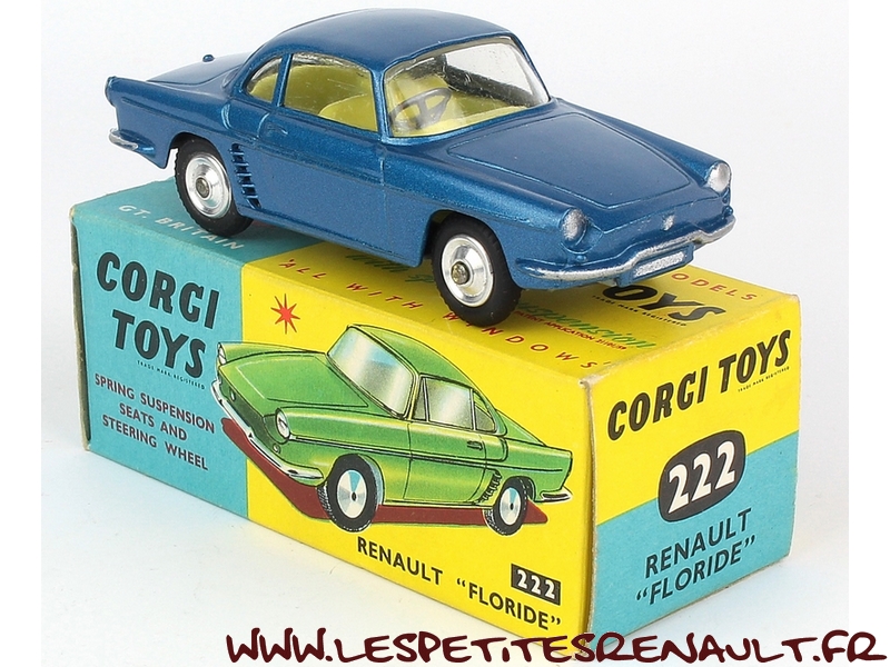Modèle : Floride coupé Année : 1962 Couleur : Bleu métallisé Echelle : 1/43 Fabricant : Corgi Toys Référence : 222 Collection : Non Matière : Zamak Série limitée : Non Boitage : Boite carton Commentaires : Modèle original Corgi Toys avec conduite à droite |