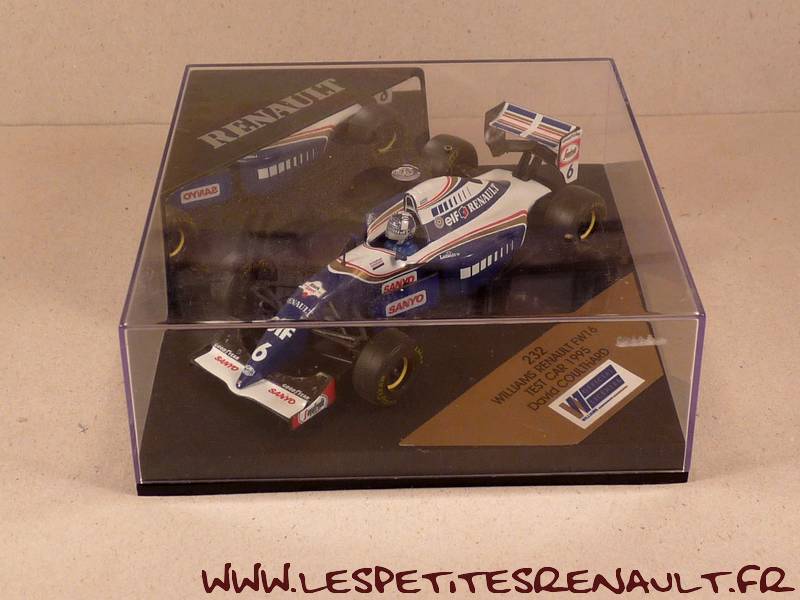 Modèle : Williams Renault FW16Année : 1995 Course : Test Car Pilote : n° 6 – David Coulthard Couleur : Bleue et blanche Fabriquant : Onyx Référence : 232 Collection : -- Matière : Zamak, châssis plastique Série limité : Non Boitage : Boite cristal 11x11 Commentaires : -- |