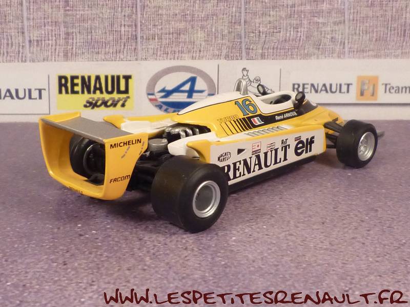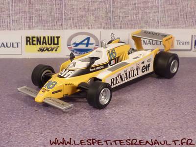 Modèle : Renault RE 20Année : 1980 Course : GP Autriche Pilote : n° 16 – B Arnoux Couleur : Jaune, blanc et noir Fabriquant : RBA Référence : -- Collection : ? (Fabbri) Matière : Zamak, châssis plastique Série limité : Non Boitage : Boite cristal 7x13 Commentaires : -- |