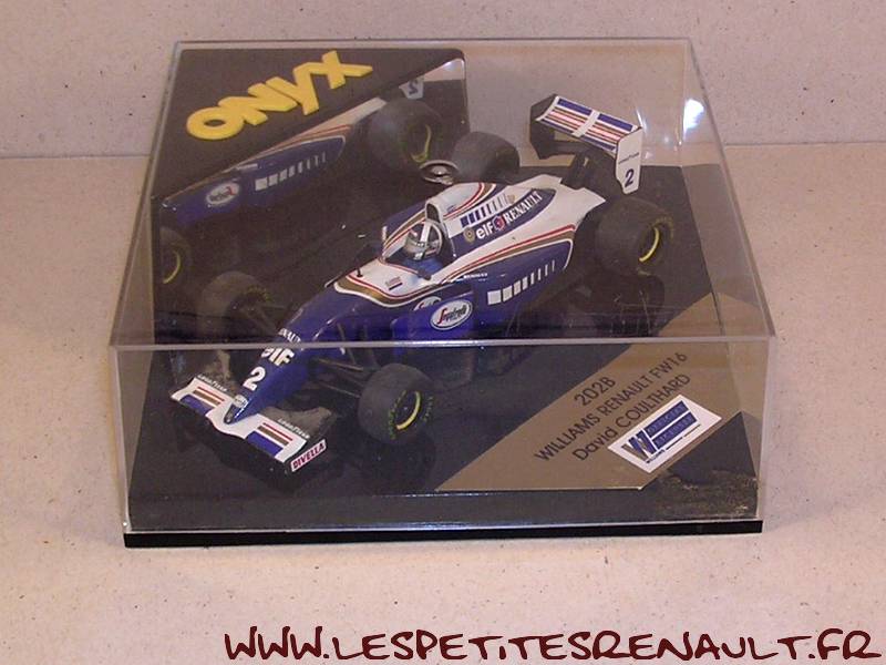Modèle : Williams Renault FW16Année : 1994 Course : Saison GP F1 Pilote : N° 2 - D Coulthard Couleur : Bleue et blanche Fabriquant : Onyx Référence : 202B Collection : -- Matière : Zamak, châssis plastique Série limité : Non Boitage : Boite cristal 11x11 Commentaires : -- |