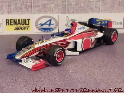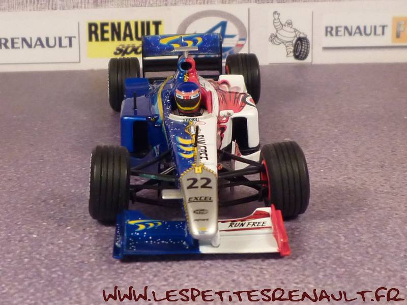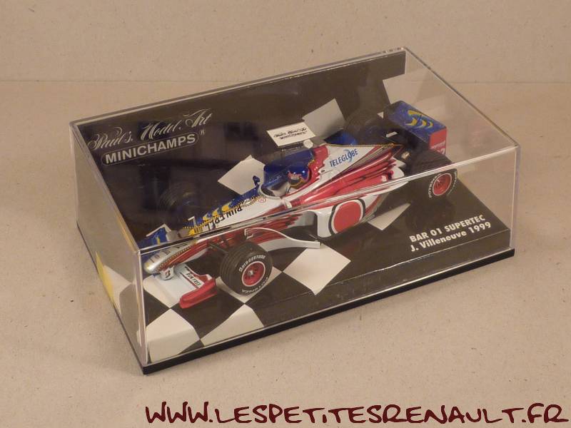 Modèle : Bar 01 SupertecAnnée : 1999 Course : Saison GP F1 Pilote : N° 22 Jacques Villeneuve Couleur : Bleu, blanc et rouge Fabriquant : Minichamps Référence : 430 990022 Collection : -- Matière : Zamak, châssis plastique Série limité : Non Boitage : Boite cristal 8x13 Commentaires : Décoration différente sur les deux côtés de la voiture |