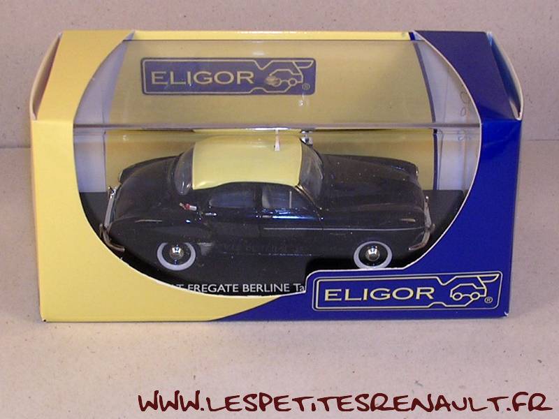 Modèle : Fregate Berline Année : 1959 Couleur : Noire et beige Echelle : 1/43 Fabricant : Eligor Référence : 100995 Collection : Non Matière : Zamak, châssis plastique Série limitée : Non Boitage : Boite cristal 7x15 + Surboite Eligor Commentaires : Version Taxi parisien. |