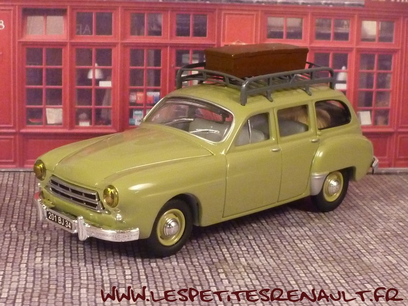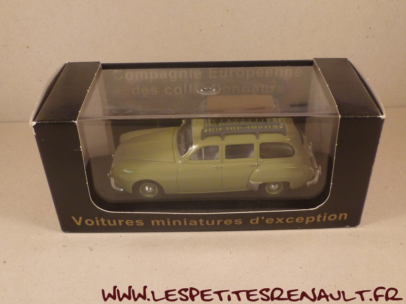 Modèle : Fregate Domaine Année : 1956 Couleur : Kaki clair Echelle : 1/43 Fabricant : Eligor Référence : V4042 (CEC) Collection : CEC Matière : Zamak, châssis plastique Série limitée : Non Boitage : Boite cristal 7x15, surboite CEC Commentaires : Version break de chasse avec malle sur le toit et chien à l'intérieur. Réalisée pour la CEC sur la base du break Eligor ref 100892 (couleur spécifique au modèle) |