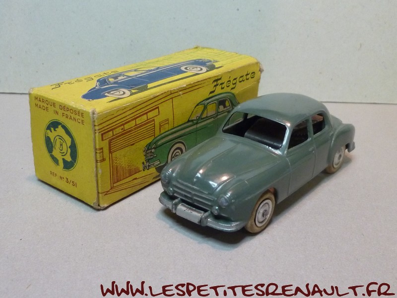 Modèle : Fregate Berline Année : 1953 Couleur : Kaki Echelle : 1/45 Fabricant : CIJ Référence : 3/51 Collection : Non Matière : Zamak, châssis tôle Série limitée : Non Boitage : Boite carton Commentaires : Version à jantes en alu avec moteur mécanique à clé. Marquage châssis en relief |