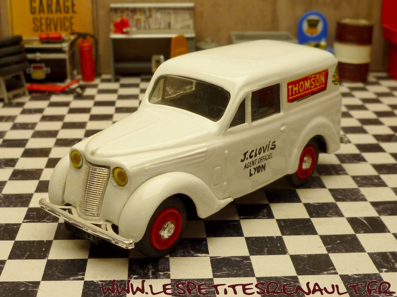 Modèle : Dauphinoise tôlée Année : 1956 Couleur : Blanche Echelle : 1/43 Fabricant : Eligor Référence : 7711149109 Collection : 100 ans Renault Matière : Zamak, châssis plastique Série limitée : 1574/2500 Boitage : Boite cristal 11x11 + surboite Renault Commentaires : Modèle réalisé dans le cadre du centenaire de Renault en 1996. Décoration Thomson |