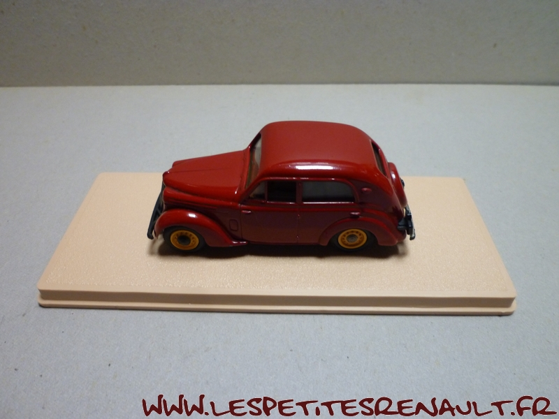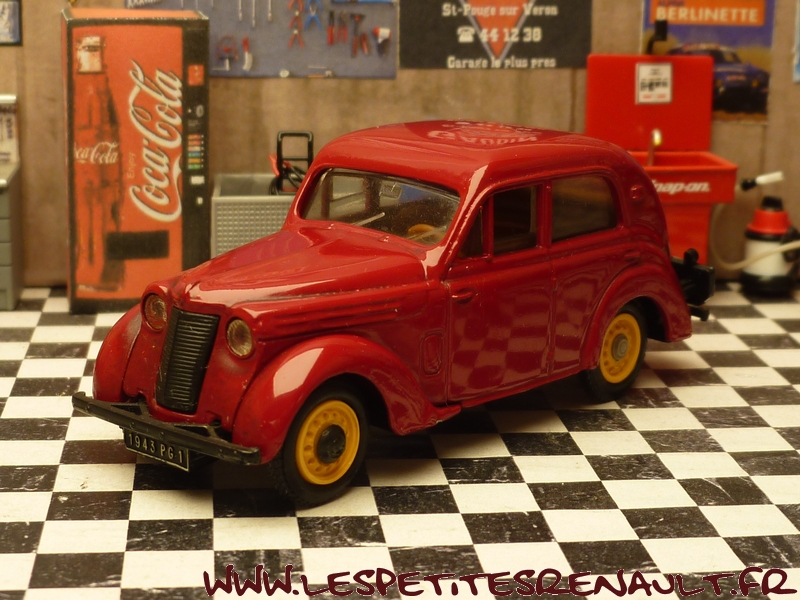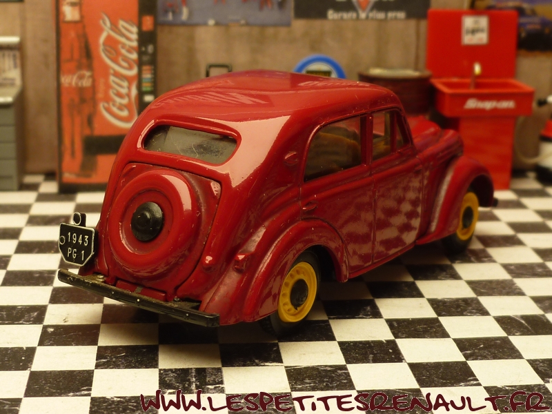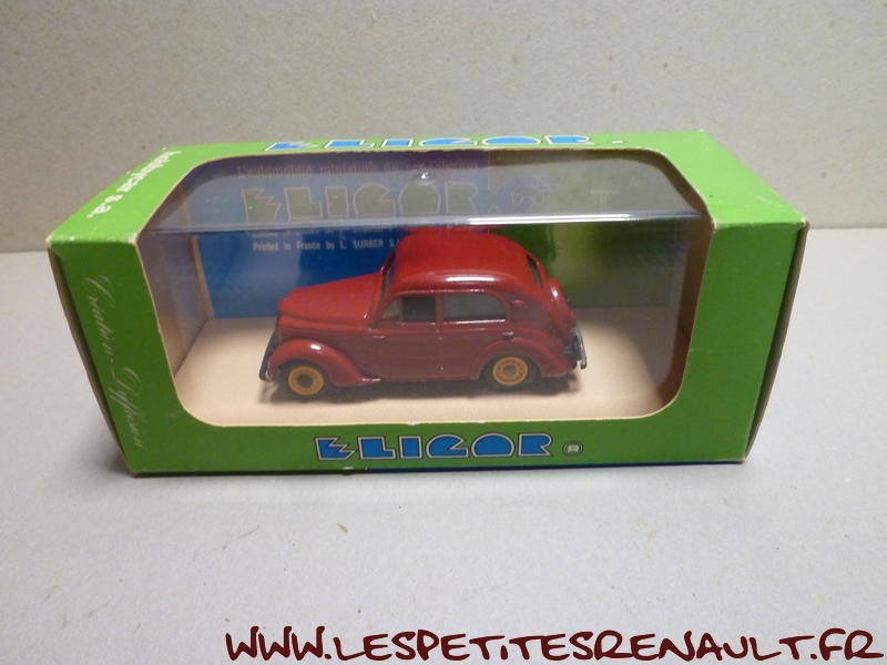 Modèle : Juvaquatre berline Année : 1943 Couleur : Bordeaux Echelle : 1/43 Fabricant : Eligor Référence : 1014 Collection : Non Matière : Zamak, châssis plastique Série limitée : Non Boitage : Boite cristal + surboite Commentaires : Modèle indiqué comme type PG1, mais le coffre ouvrant la positionne après 1940. Plaque marquée 1943, donc de type BFK3. |