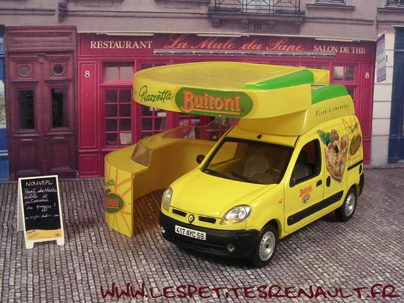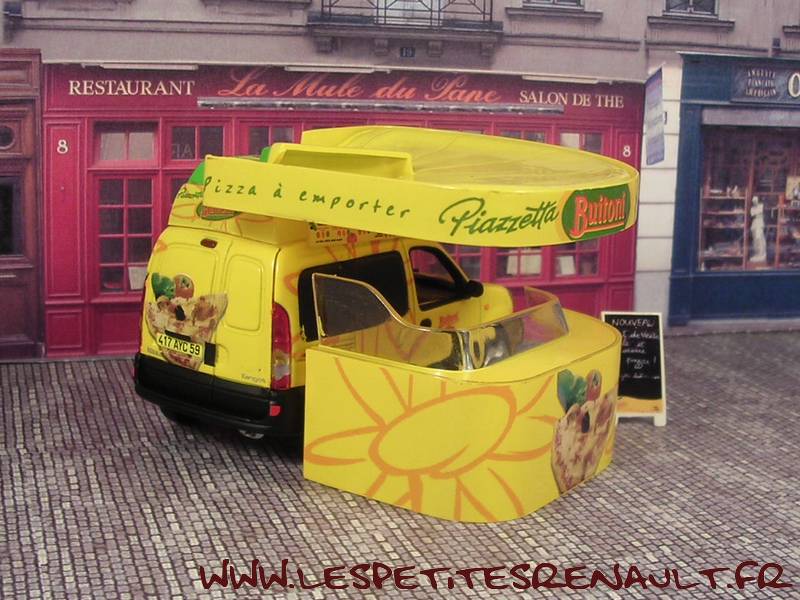 Modèle : Kangoo I phase 2 tôlé Année : 2004 Couleur : Jaune Echelle : 1/43 Fabricant : Norev Référence : 7711224132 Collection : Non Matière : Zamak, châssis plastique Série limitée : Non Boitage : Coffret Commentaires : Décoration Buitoni. Livré avec un stand en forme de pizzeria. Vu sur le Tour de France 2004 |
