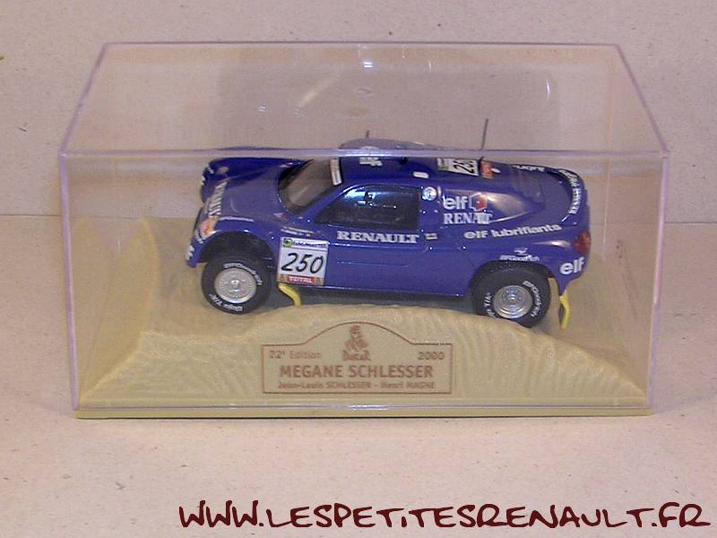 Modèle : Megane Schlesser Année : 2000 Course : Paris-Dakar Equipage : #250 - Schlesser/Magne Couleur : Bleu marine Echelle : 1/43 Fabricant : Norev Référence : 11 Collection : La Légende du Dakar (M6) Matière : Zamak, châssis plastique Série limitée : Non Boitage : Boite cristal 8x15 Commentaires : Livré sans les décorations publicitaires Gauloises |
