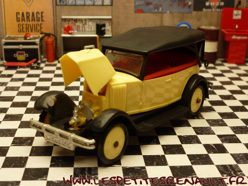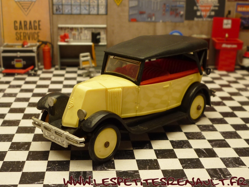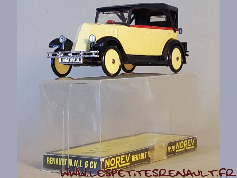 Modèle : NN2 Torpedo Année : 1929 Couleur : Beige et noire Echelle : 1/43 Fabricant : Norev Référence : 78 Collection : Non Matière : Plastique Série limitée : Non Boitage : Boite plastique + socle carton Commentaires : Modèle qui servira de base pour la réalisation du moule des NN Eligor Modèle indiqué comme NN1 1928 mais la présence du pare-chocs doubles et les ailes galbées en font un type NN2 de 1929. Version capotée avec ailes noires, caisse beige et capote noire |