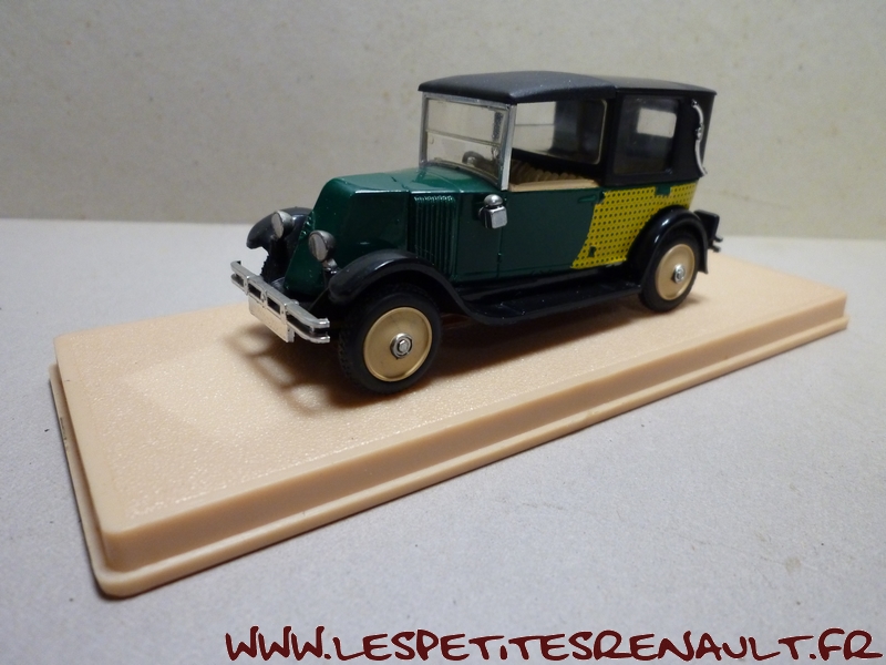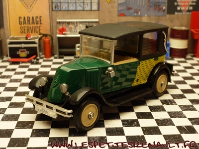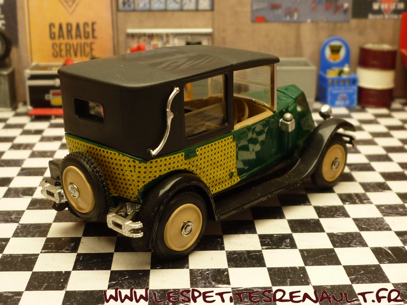 Modèle : NN Coupé de Ville Année : 1927 Couleur : Noir, vert cannage jaune Echelle : 1/43 Fabricant : Eligor Référence : 1041B Collection : N/A Matière :Zamak, châssis plastique Série limitée : Non Boitage : Boite cristal 6x15, surboite Eligor Commentaires : Présentée par Eligor comme un KZ coupé chauffeur 1928 (aussi appelé Coupé de Ville). Le modèle de base utilisé par Eligor avec la présence du pare-chocs doubles et les ailes galbées en font un type NN2 de 1929, Coupé de Ville couvert. Version couverte avec ailes noires, caisse verte avec cannage jaune et capote noire |