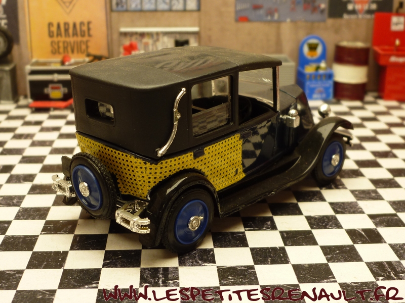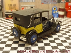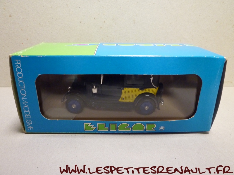 Modèle : NN2 Taxi Année : 1929 Couleur : Noir, bleu marine cannage jaune Echelle : 1/43 Fabricant : Eligor Référence : 1042 Collection : N/A Matière :Zamak, châssis plastique Série limitée : Non Boitage : Boite cristal 6x15, surboite Eligor Commentaires : Version taxi parisien Modèle indiqué comme Type NN 1927 mais la présence du pare-chocs doubles et les ailes galbées en font un type NN2 de 1929. Version couverte avec ailes noire caisse bleu marine avec cannage jaune et capote noire |