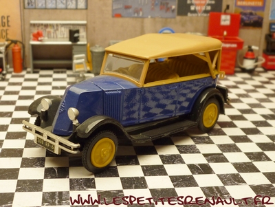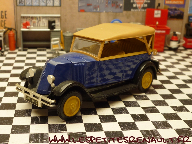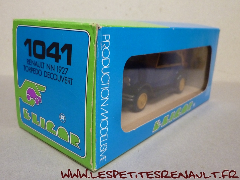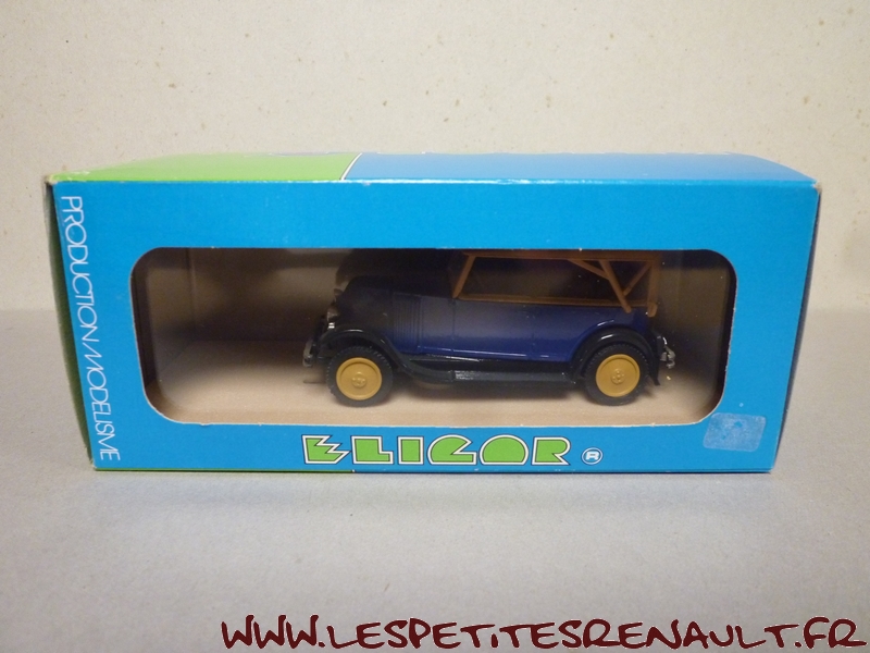 Modèle : NN2 Torpédo Année : 1929 Couleur : Bleu et beige foncé Echelle : 1/43 Fabricant : Eligor Référence : 1041 Collection : N/A Matière :Zamak, châssis plastique Série limitée : Non Boitage : Boite cristal 6x15 Commentaires : Version torpédo capoté Modèle indiqué comme [Torpédo NN 1927] mais la présence du pare-chocs doubles et les ailes galbées en font un type NN2 de 1929. Version avec ailes noires, caisse bleue marine et capote beige foncée |