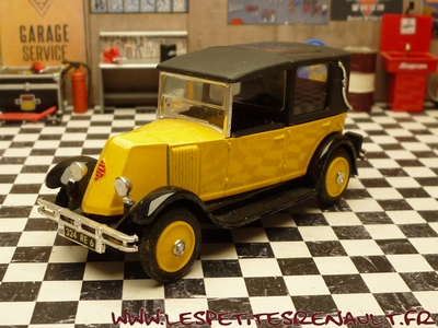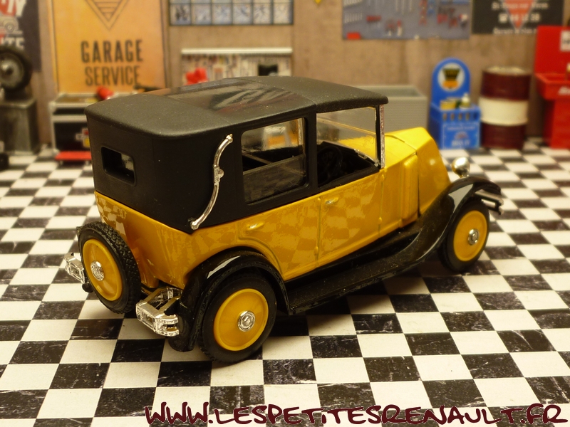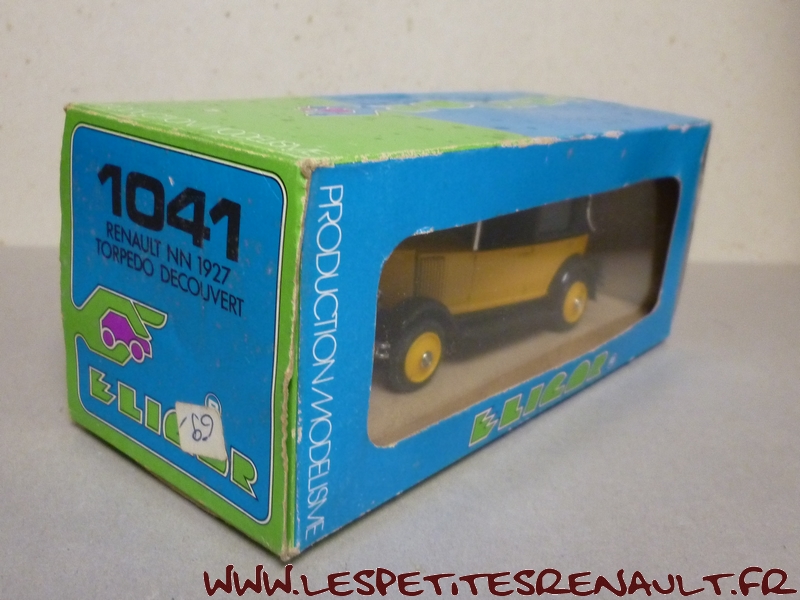 Modèle : NN2 Coupé de Ville Année : 1929 Couleur : Jaune et noire Echelle : 1/43 Fabricant : Eligor Référence : 1041 Collection : N/A Matière :Zamak, châssis plastique Série limitée : Non Boitage : Boite cristal 6x15, surboite Eligor Commentaires : Présentée par Eligor comme un KZ coupé chauffeur 1928 (aussi appelé Coupé de Ville). Le modèle de base utilisé par Eligor avec la présence du pare-chocs doubles et les ailes galbées en font un type NN2 de 1929, Coupé de Ville couvert. Version couverte avec ailes noires, caisse bune et capote noire Inscription erronée sur la boite : 1041 - Renault NN 1927 - Torpédo découvert |