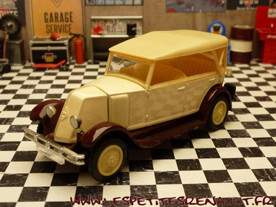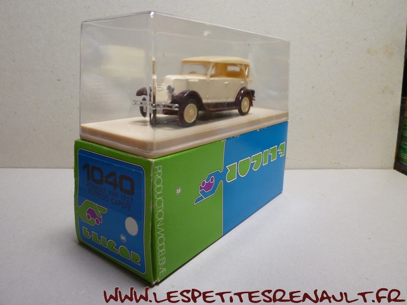 Modèle : NN2 Torpédo Année : 1929 Couleur : Ivoire et bordeaux Echelle : 1/43 Fabricant : Eligor Référence : 1040 Collection : N/A Matière :Zamak, châssis plastique Série limitée : Non Boitage : Boite cristal 6x15 Commentaires : Version torpédo capoté Modèle indiqué comme [Torpédo NN 1927] mais la présence du pare-chocs double et les ailes galbées en font un type NN2 de 1929. Version avec les roues ivoires, les ailes bordeaux, la caisse ivoire et la capote beige clair |
