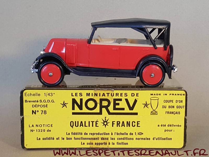 Modèle : NN2 Torpedo Année : 1928 Couleur : Rouge et noire Echelle : 1/43 Fabricant : Norev Référence : 78 Collection : Non Matière : Plastique Série limitée : Non Boitage : Boite plastique + socle carton Commentaires : Modèle qui servira de base pour la réalisation du moule des NN Eligor Modèle indiqué comme NN1 1928 mais la présence du pare-chocs doubles et les ailes galbées en font un type NN2. Version capotée avec ailes noires, caisse rouge, intérieur beige et capote noire |